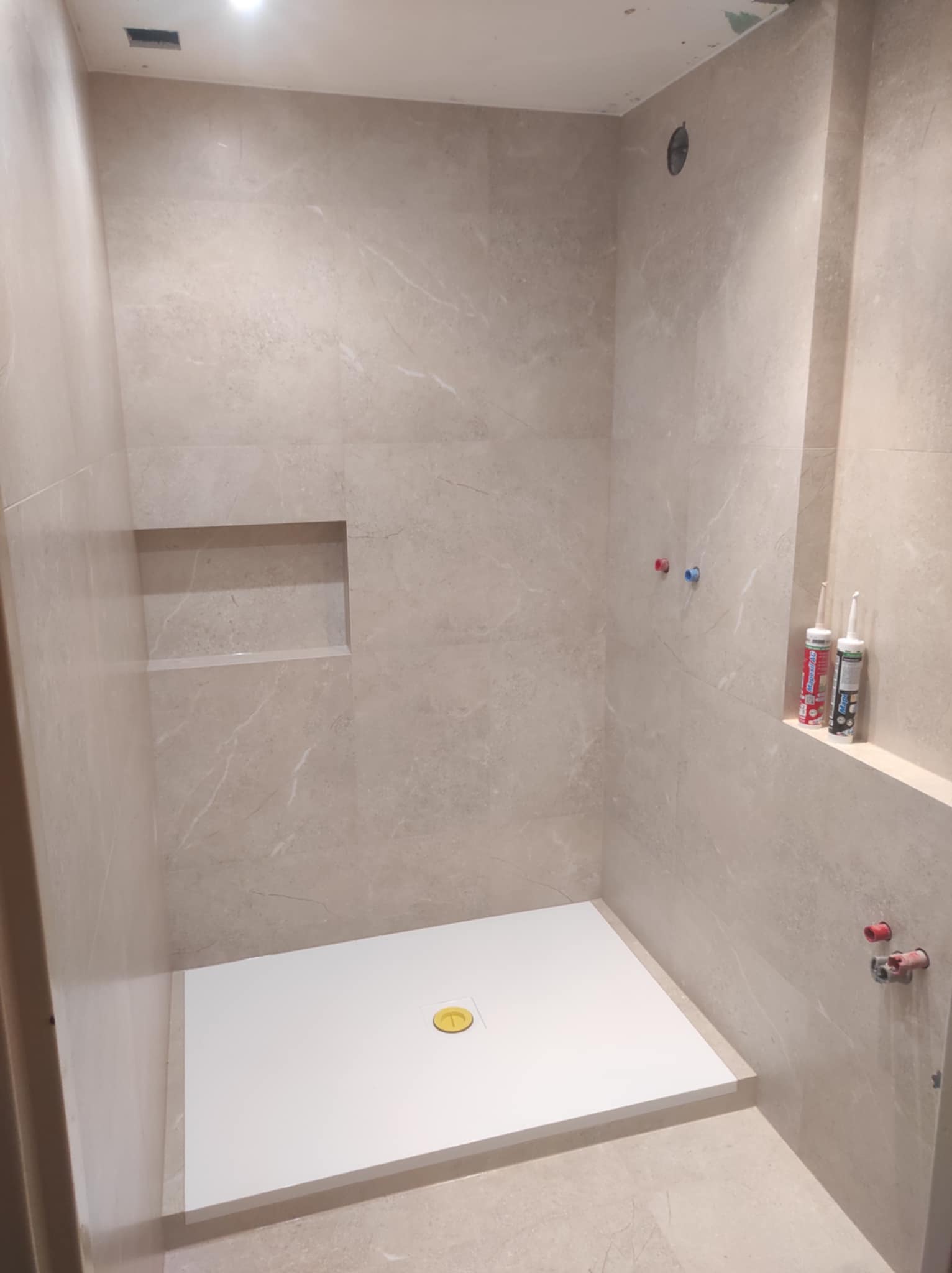 Obklad koupelny v béžových tónech – čisté linie díky instalaci bez lišt