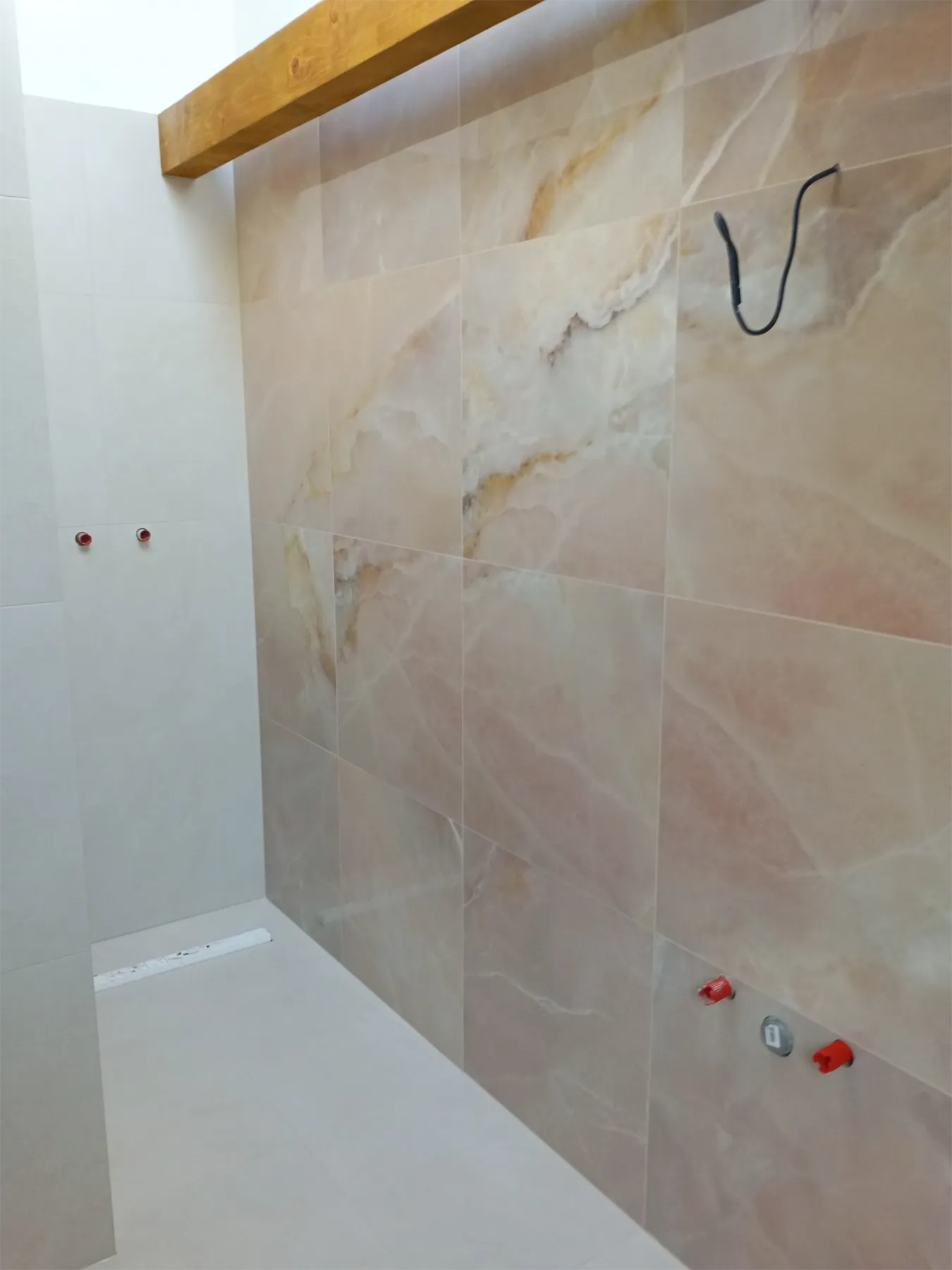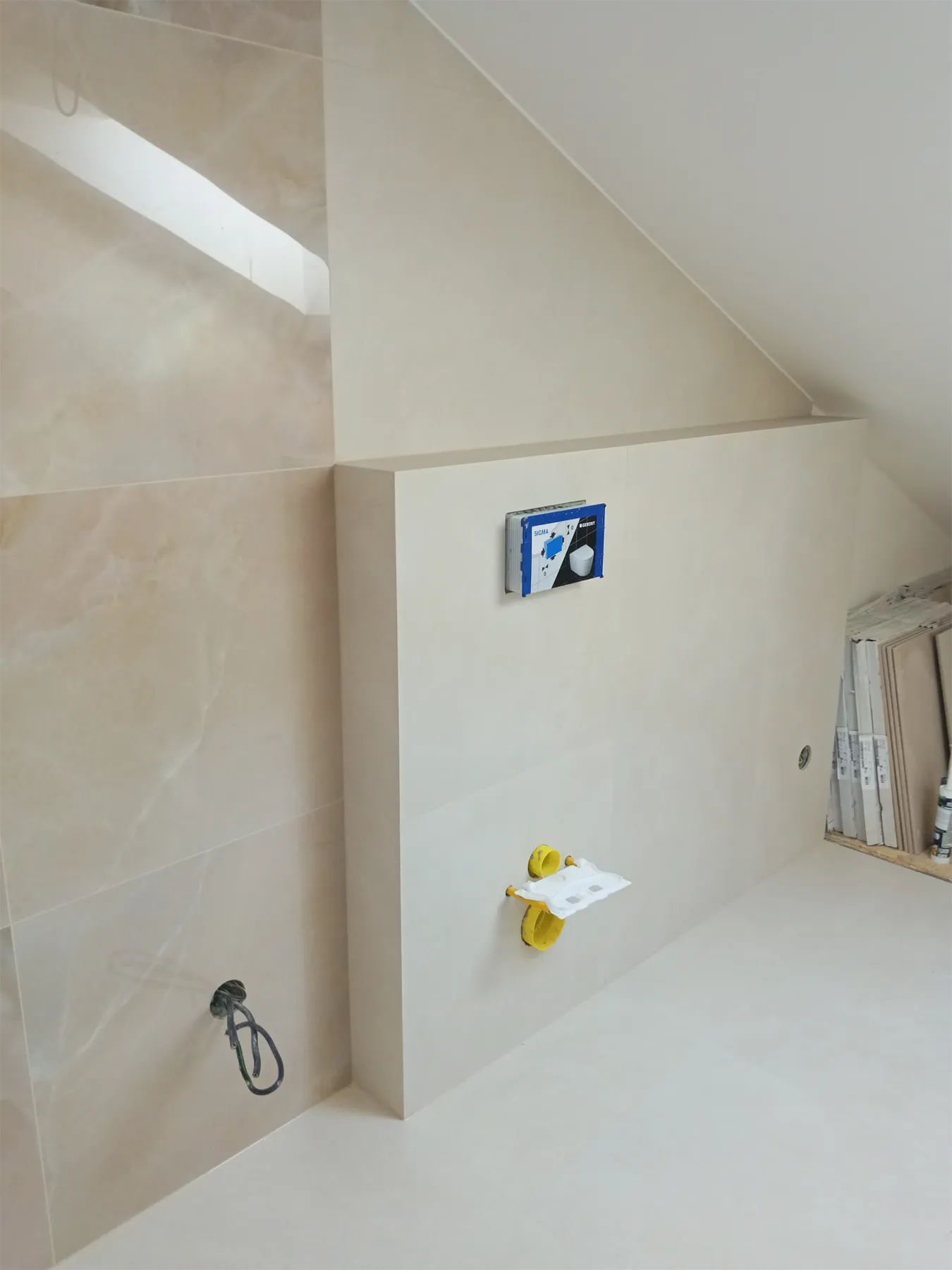 Tato realizace přináší moderní přístup k obkladu koupelny, kde hlavní roli hrají světlé béžové odstíny. Ty dodávají prostoru vizuální lehkost, příjemné teplo a nadčasový charakter. Při pokládce byl kladen důraz na přesné vedení spár, čisté řezy a sjednocení všech prvků tak, aby celek působil harmonicky a elegantně.